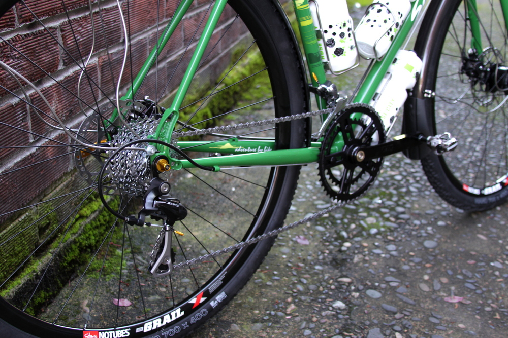 - Handbuilt wheelset- Stan's Grail tubeless rims, Shimano Alfine dynamo front and XT rear hubs, DT Alpine spokes in back and Competition spokes in front, black brass nipples. WTB Nano 40mm tires, set up tubeless.