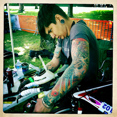 This weekend I will be at Blue Lake doing race support for the Rev3 Triathlon. Today we spent the day doing race tunes/check overs. Tomorrow we will be neutral support. It will be interesting to ride in a car while the race is right beside me. Then I get to jump out anytime there is a problem and do some quick fixin’. Uhhhh, yes…. It’s pretty bad ass. I was surprised to see how many people traveled far for this race. I am not familiar with Tri races so I didn’t really know this was a big deal. Who knew? I wasn’t the only one from our shops who went to represent. I brought the newest member to our family, Muck. He is wrenching over at our sister shop, Fat Tire Farm.Muck has had a lot of experience as a race mechanic and does the Hawaii Ironman every year, so it was great to have him to work with. My friend, Jason, also joined us and checked in bikes as they came and handled the general order of the repairs Muck and I had.