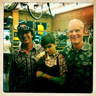 A portion from the New Zealand based Pure Black Racing road team stopped by the store today for a little chat. I guess our charisma has world wide appeal. I like to think of the nail that one of the riders had through his tire or tyre as simply an excuse to come in and visit. Friends, you don’t need an excuse, sure as a group of highly talented super attractive individuals who when combined as a sales force create a unified socio-cultural force that if drawn looks a lot like Voltron,